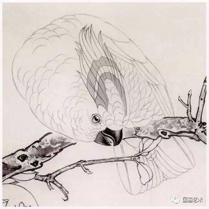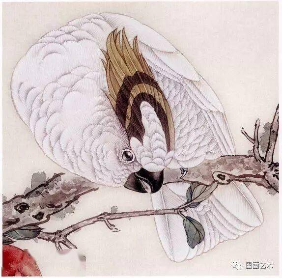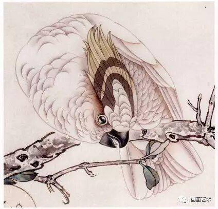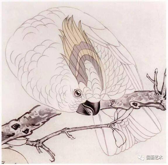 画葵花鹦鹉白主要技法是粉丝粉染法。先用墨分染嘴,明暗变化要柔和自然。然后用藤黄分染鸟白身体结构及明暗变化,要体现丝滑质感与体积效果。用白粉丝羽片,注意有虚有实,远处的羽片稍淡,这样能更好表现身体浑厚效果。丝毛以白粉为主,可适当提一点赭黄鹏线,以增强体面关系。最后轻罩白粉使羽毛统一起来。画时先观察体会,了然于胸再动笔。