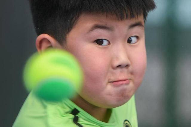 2024年3月22日,在湖北省京山市文峰公园网球场,湖北省网球学校学生杨庾镍在训练中。湖北省网球学校是一所全日制“省校县办”示范学校,该校以“学训并重、文体双优”为办学理念,涵盖义务教育阶段文化课教学与专业网球训练。新华社记者 杜子璇 摄