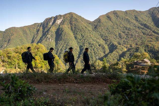 2024年10月22日,邱昌红(右一)和队员在茅胡岭巡护途中。邱昌红是神农架国家公园管理局木鱼管理处三堆河管护中心的负责人,他和其他4名队员共同负责12.6万余亩山区的巡山护林工作。工作近四十年来,邱昌红的巡护里程累计超过2.5万公里,植树3万余株。新华社记者 杜子璇 摄