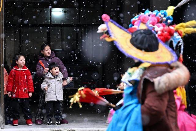 我相继拍摄了土家族摆手舞、织锦“西兰卡普”、利川灯歌等系列非遗。利川灯歌是人们逢年过节、喜庆集会之时,以彩龙船等为道具,划地为台的一种民间表演形式,群众互动性强。我的采访拍摄时间是春节假期后两天,节日的气氛尚未消散。拍摄当天下起小雪,穿梭于街头巷尾的灯歌队在漫天飞雪中载歌载舞,引得路旁游人驻足观看。我抢在行进的灯歌队前,选了一处有几个小朋友好奇观看的位置,等待队伍中演员路过时摁下快门。前景中的演员服装形象与背景里孩子们兴奋的神情形成呼应,脑海中的画面变成现实,我拍到了自己想要的照片。