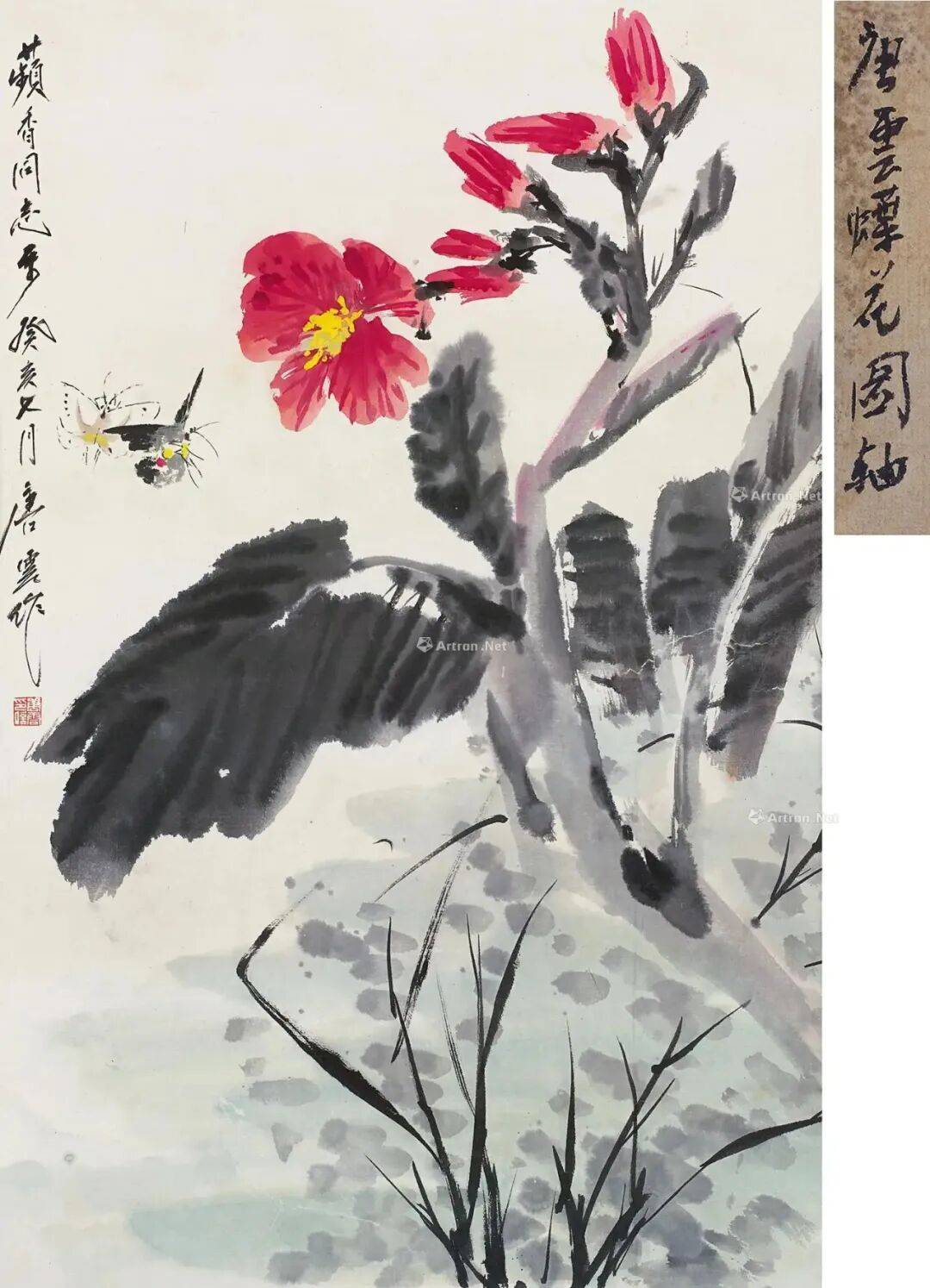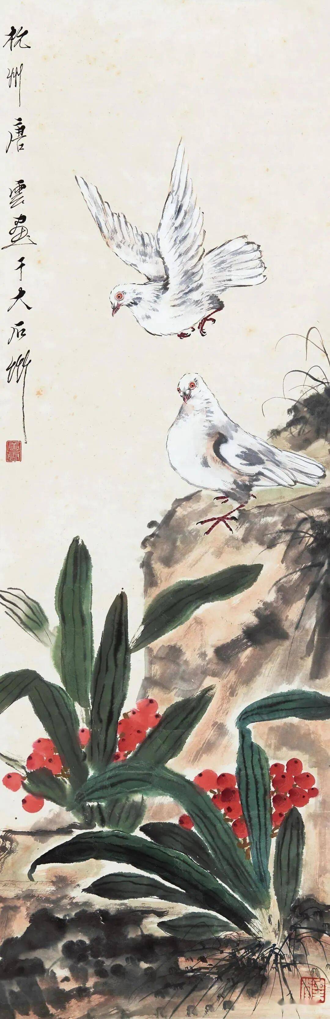 唐云花鸟取法八大、冬心、新罗诸家,山水自元四家入手,兼涉明代沈石田、清代抓住特点大胆落墨,细心收拾,笔墨上能融北派的厚重与南派的超逸于一炉,清丽洒脱,生动有效。