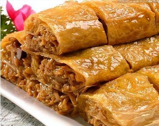 做法:1.豆腐皮摊开,两张一个叠成方形,放入平底锅中煎制两面金黄后盛出待用