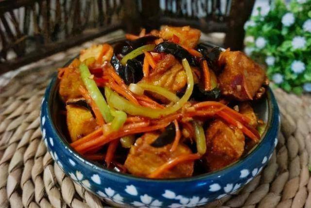 豆腐从盐水中捞出沥干水分,热锅凉油,放入蒜末爆香,放胡萝卜木耳翻炒,听到木耳爆出响声,放豆腐翻炒,至金黄色,