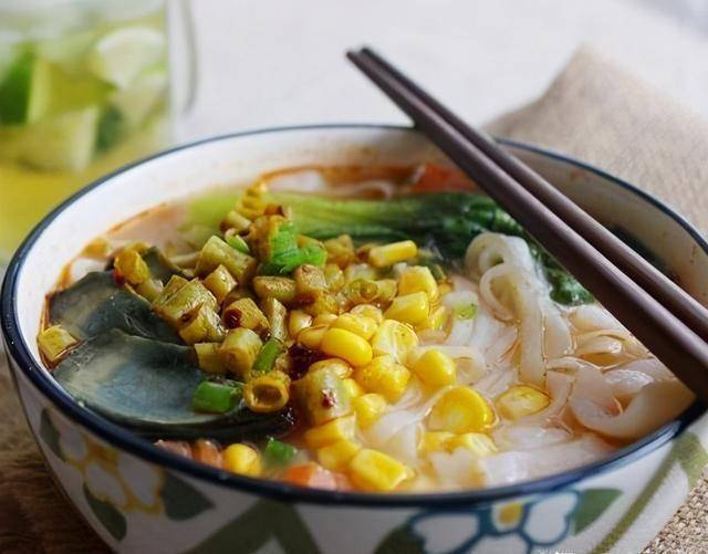 用料河粉麻油番茄玉米粒小青菜酸豇豆皮蛋小葱白醋鸡精盐