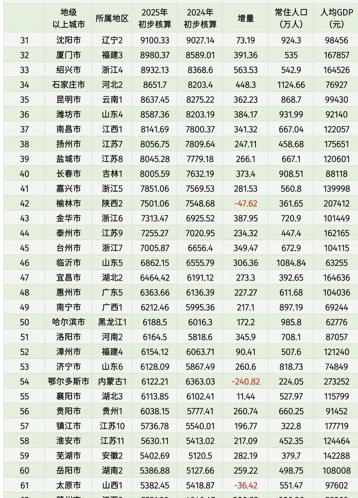 有城市高歌猛进,也有城市面临挑战。 广东的佛山2025年GDP为13157.35亿元,相比2024年出现了1.53%的负增长,排名也有所下滑。 内蒙古的鄂尔多斯,GDP从2024年的6363.03亿元降至6122.21亿元,下降了3.78%。 这些波动背后,往往与产业结构调整、外部市场环境变化密切相关。