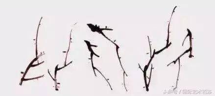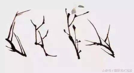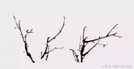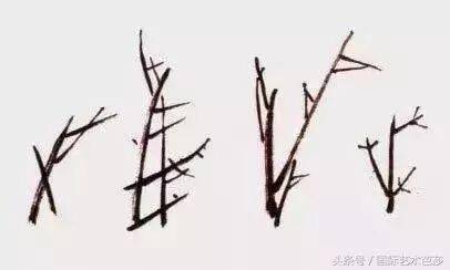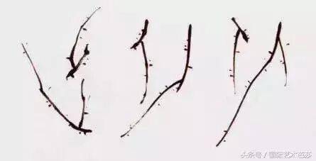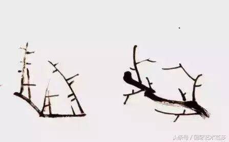 在实际生活中也是如此,但在实际绘画中并非这样简单。一不小心就会出现两枝并立现象,这时就需要找出解决这个问题的办法,就是采用破的方法用线的粗细、长短、虚实的角度不同来处理问题就更为合适。如三枝交于一点,并字出现在画面中,根据交插的面积大小、“井”字位置的大小要找出解决这一矛盾的最佳手段。把这些矛盾处设一组梅花,把井不会出现绝对的井字,而是变形的井字。对初学者而言,这个方法并不最佳,最佳的方法是不出现“井”字。