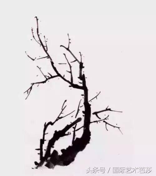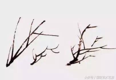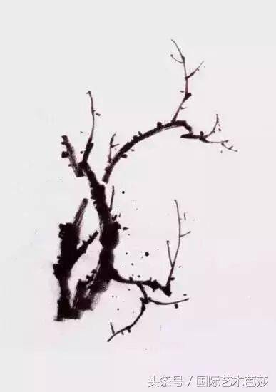 画梅花枝干用中号石灌笔以侧锋、中锋与藏锋相结合的笔法,先上后下,先左后右,运笔藏起回收,下笔藏锋,收笔回锋。枝干千姿百态,一般是先画主枝千、最上面的枝干、最前面的枝干、最大的枝干,其次是小枝干、后面的枝干。从墨的韵味和色度上也能够区分出前后主次为佳。这就是所说的层次感。画枝一波三折,有曲直有顿挫、提按,转折速度有机补之笔要使观者感觉没有补。枝细可补粗,枝短可补长,细枝补粗较易,但接的长短衔接处并非好补。两笔重叠水分过大使衔接处容易跑下笔时,笔根先蘸较深点的淡墨,再蘸浓墨,在盘中轻顿,使浓淡浑然,行笔要快,使墨味丰润。若画大梗,与画老干方法相同。要上实下虚,曲直相间刚柔相间。梗与老干的衔接处,要有意识地画出飞白,衔接处可用勾勒法勾出明暗结构线,而后用淡墨干笔皱擦。