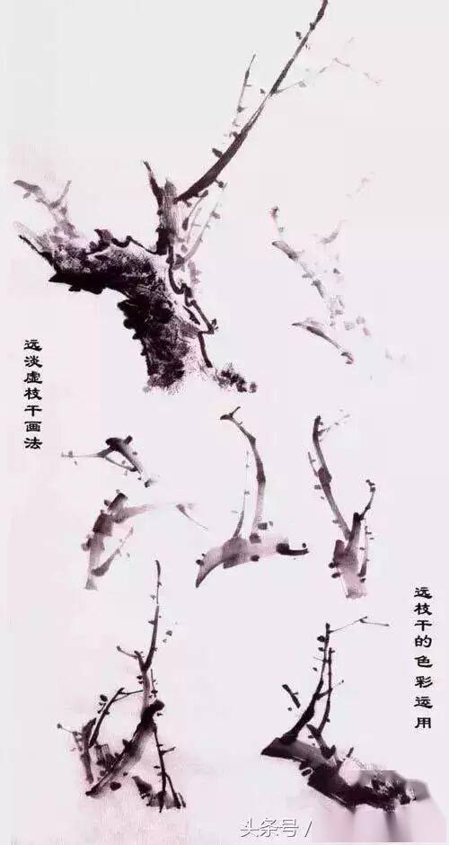一幅主体梅花完成后,让画面显得更有层次、开阔、深远。用淡墨或淡墨加淡彩来描绘远、虚的枝干使画面才能显得有层次,有深远,有厚度。其次是补充主体的不足,衬托主体,使主体更加突出。远枝干在画面中占有相当分量的位置,那么我们对远虚的枝干是不能懈怠的,得与画主体画同样的态度来对待。
