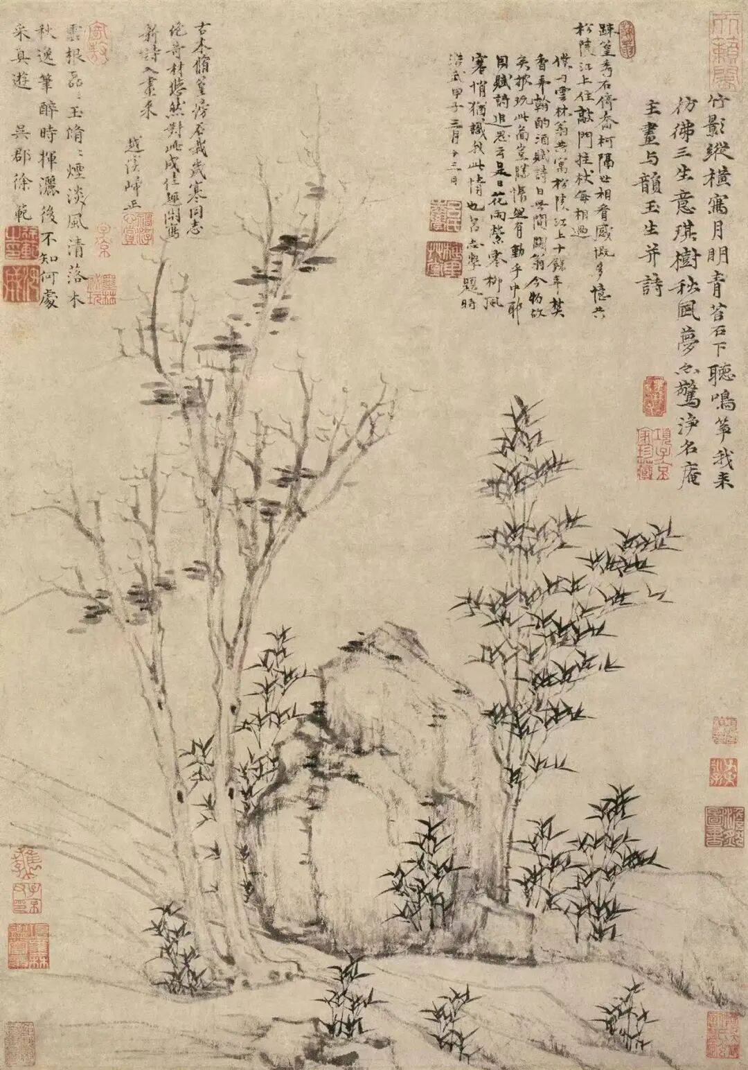根据二作题记,《竹石图》作于洪武元年(1368)三月,《苔痕树影图》作于洪武五年(1372)十一月五日,皆作于倪瓒极晚年。统计归入倪瓒名下,真伪包括在内的古木竹石题材画作,有二十余件。其中的部分画作,如北京故宫博物院藏《古木竹石图》,济南市博物馆藏《枯木竹石图》,肖燕翼、毛代炜、吴皙来等学者已从笔墨、构图、著录等角度予以辨伪。[6]这些作品,按照竹叶向上或向下的处理方式可分成两大类,《竹石图》及《苔痕树影图》即在竹叶向下的类别中。除了这两件作品,刻画竹叶向下的作品另有如下十件:1.《梧竹秀石图》,无纪年(作于1354年之前),北京故宫博物院藏;2.《岸南双树图》,至正十三年(1353)二月二十九日,普林斯顿大学艺术博物馆藏;3.《古木幽篁图》,无纪年(约14世纪50年代晚期),北京故宫博物院藏;4.《竹树野石图》,至正二十三年(1363)二月一日,台北故宫博物院藏;5.《古木竹石图》,无纪年,北京故宫博物院藏;6.《树石幽篁图》,洪武元年(1368)无月日,北京故宫博物院藏;7.《丛篁古木图》,无纪年(约1369年),南京博物院藏;8.《竹石霜柯图》,无纪年,上海博物馆藏;9.《绿水园图》,无纪年,王季迁旧藏;10.《筠石古槎图》,无纪年,台北故宫博物院藏。[7]