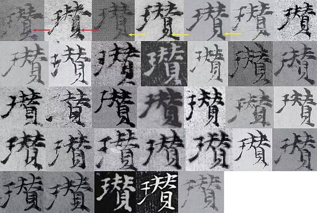 图 8ˉ“瓒”字字例,各字例采自倪瓒1365年之后的书作。第一行:《竹石图》、《苔痕树影图》、36、39、40、43、44;第二行:46、49、51、57、59、60、62;第三行:65、66、67、68、69、71、72;第四行:73、74、75、77(两例)、79、80;第五行:82(两例)、83、84、104