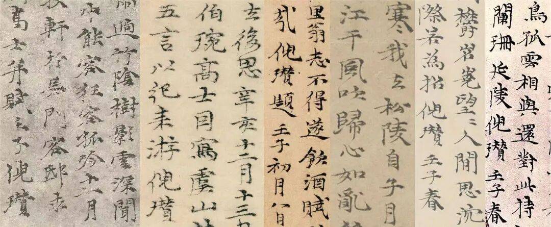 图 27ˉ《苔痕树影图》伪题与倪瓒同时期书作的对比。自左向右:《苔痕树影图》题记(局部);《虞山林壑图》题记(局部),洪武四年(1371)十二月十三日,大都会艺术博物馆藏;张雨《自书诗册》第二跋(局部),洪武五年(1372)一月八日,吉林省博物院藏;《江亭山色图》题记(局部),洪武五年(1372)二月二十五日,台北故宫博物院藏;赵伯骕《万松金阙图》题跋(局部),洪武五年(1372)春,北京故宫博物院藏;《春山图》题跋(局部),洪武五年(1372)春,藏地不详