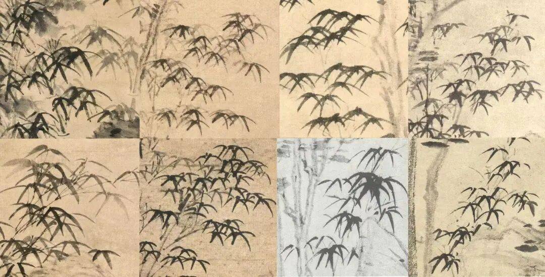图 31ˉ倪瓒部分真迹画作中的竹叶局部。第一行从左至右:《梧竹秀石图》(局部),无纪年(1354年之前),北京故宫博物院藏;《岸南双树图》(局部),至正十三年(1353)二月二十九日,普林斯顿大学艺术博物馆藏;《古木幽篁图》(局部),无纪年(约14世纪50年代晚期),北京故宫博物院藏;《树石幽篁图》(局部),洪武元年(1368),无月日,北京故宫博物院藏。 第二行从左至右:《丛篁古木图》(局部),无纪年(约1369年),南京博物院藏;《竹石霜柯图》(局部),无纪年,上海博物馆藏;《绿水园图》(局部),无纪年,王季迁旧藏;《筠石古槎图》,无纪年,台北故宫博物院藏
