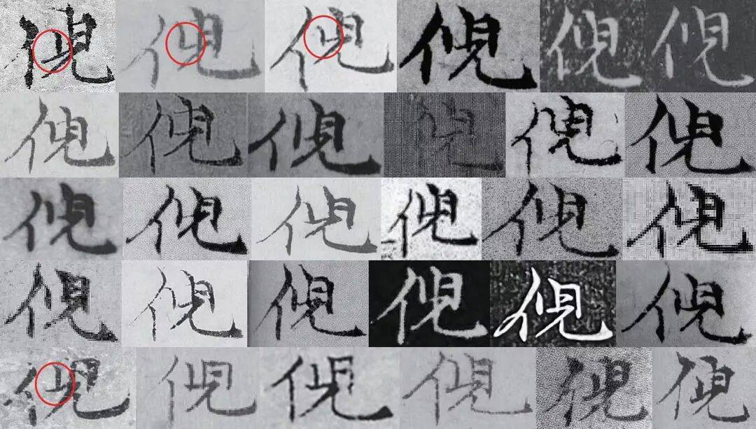 图 26ˉ“倪”字字例,采自倪瓒1368—1374年的书作。第一行:《苔痕树影图》、46、49、 52、57(两例);第二行:59、60、61、64、65、67;第三行:68、69、72、73、74、77;第四行:78、79、80、83、84、86;第五行:1、2、4、9、伪14、伪19