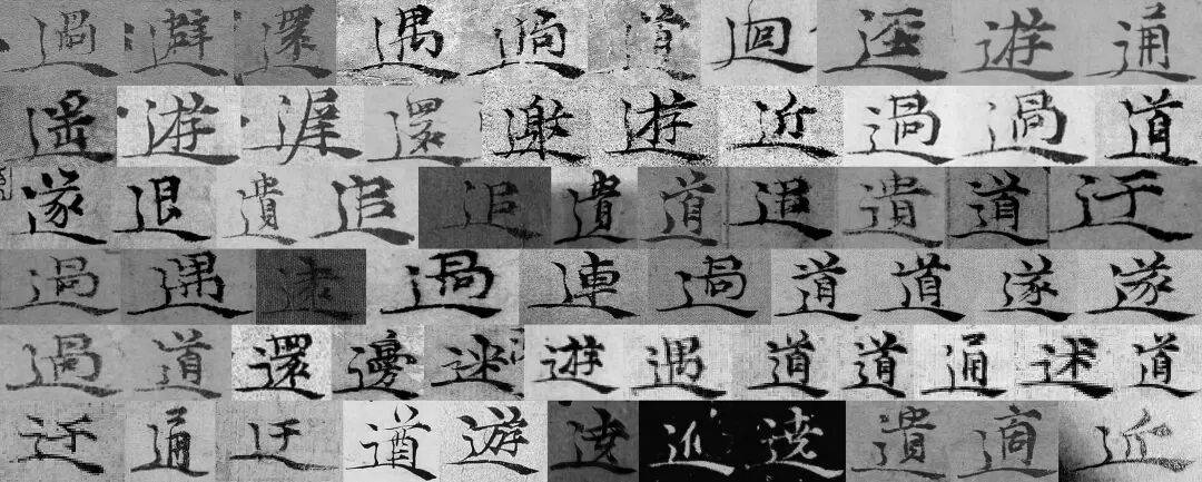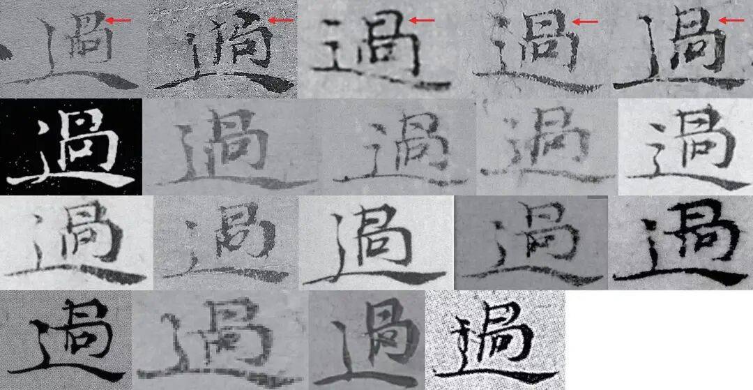 图 5ˉ“过”字字例,各字例出处如下。第一行:《竹石图》、《苔痕树影图》、4、18、22;第二行:28、30、32(两例)、49;第三行:49、51、55、63、65;第四行:67、71、94、102。需要特别说明的是,本文图版说明中的数字编号均对应附录一所示倪瓒书作,如编号1为《秋林野兴图》第一题,编号18为《致默庵先生札》,下文不再赘述