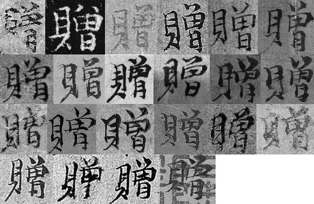 图 9ˉ“赠”字字例,各字例出处如下。第一行:《苔痕树影图》、3、6、8、16、34;第二行:41、43、55、61、62(两例);第三行:75、80、82、90、91、95;第四行:102(3例)、伪12