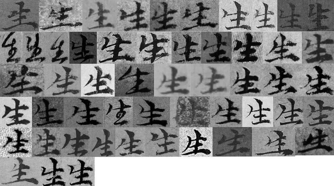 图 14ˉ“生”字字例,各字例出处如下。第一行:《竹石图》、1、10、13(两例)、17、18(两例)、19(两例);第二行:20(3例)、21(3例)、22(两例)、23、39、41;第三行:45、47、49、50、53(3例)、54(两例);第四行:55、56、63、66、67、71、76、79、82、85;第五行:89、90、92、94、97(两例)、102、伪4、伪7(两 例);第六行:伪8、伪15(两例)
