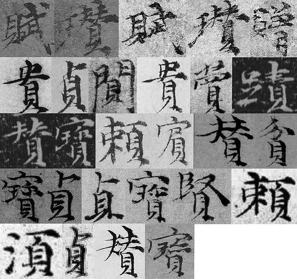 图 10ˉ“贝”部字例,采自倪瓒1365年之后的书作。第一行:《竹石图》(两例)、《苔痕树影图》(3例); 第二行:39、43、45、49、51、57;第三行:57(两例)、59(两例)、63(两例);第四行:63、67、69(3例)、73;第五行:73、77、79、85
