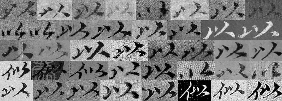 图 12ˉ“以”字字例,各字例出处如下。第一行:《竹石图》、1、5、6、13、15、16、19;第二行:20(两例)、21、22(3例)、31(两例);第三行:34、35、39、44、51(两例)、53(两例);第四行:55、63(两例)、65、67、69、71、78;第五行:79、80(两例)、81、82、84、102(两例)