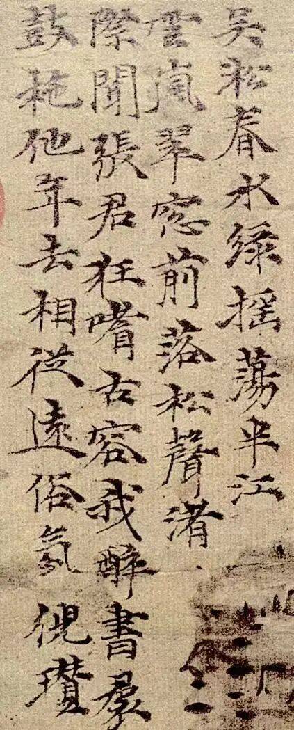 事实上,除上述两件作品,通观倪瓒所有传世书迹,或许还应将一件作品归入这一书风之下,即现藏上海博物馆、传为张中所绘的《吴淞春水图》,上有倪瓒题跋(图29、图30)。此画经顾复、徐邦达先生考证,已归入张中名下。[5]倪瓒题跋云:“吴淞春水绿,摇荡半江云。岚翠窗前落,松声渚际闻。张君狂嗜古,容我醉书裙。鼓柂他年去,相从远俗氛。倪瓒。”细观其书写特征,如“荡”“岚”“落”“声”“从”“远”“俗”“瓒” 等字点画特征,以及“氵”部、“辶”部、“贝”部等构件,均呈现出用笔轻浮不稳、结体欹侧、线条弯曲过度、笔势控制力不足等问题,这些书写特征与《竹石图》《苔痕树影图》题记相似,或可视为同一作伪体系中的产物。至于《吴淞春水图》画作本身,因为张中的传世画作有限,无从比对,真伪有待进一步考察。
