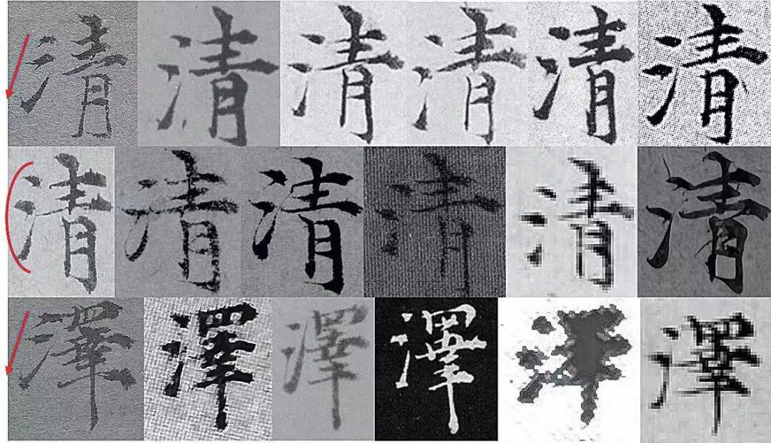 “清”“泽”二字作为“氵”部的例字,其书写形态亦与倪瓒其他书作中的同字字例存在显著差异(图21第一行首字、第三行首字)。倪瓒惯常的写法中,“氵”部三点呈弧形排列,尤以中点“丶”向左突出为一大特征。而在《竹石图》中,“清”“泽”二字的“氵”部却无此种穿插错落的结体形式。此类偏离难以归因于偶发性的书写变异,尤其是在其他字例中该部首仍保持稳定形态的情况下,而更可能指向不同书写者所为。