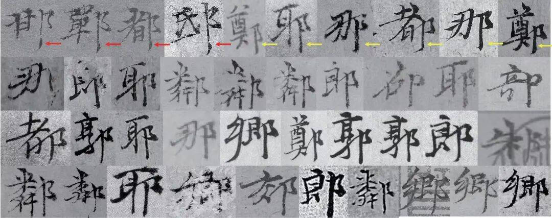 最后,可进一步观察两图题记在特定笔画与部首处理上的一致性偏差。如第五行所示六个“辶”部字例,末笔皆呈明显波磔之势,下笔轻浮,过分弯曲,毫无沉着之气。第六行中如“轩”“邯”“郸”“邸”等含长竖画的字,其行笔普遍生硬,收势欠稳,末段笔力难以维持,致使收笔时需临时调整方向,线条因此出现突兀转折,力道无法顺畅贯通。
