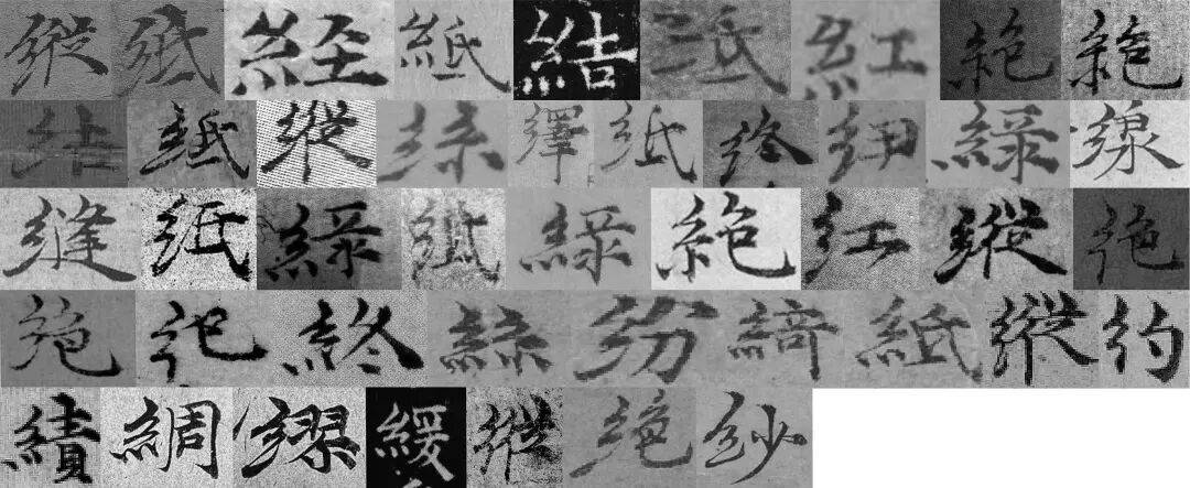 图 22ˉ“纟”部字例,各字例出处如下。第一行:《竹石图》(两例)、1、2、3、5、10、12、16;第二行:19、22、23、26、29、32、34、35、40、42;第三行:42、44、45(两例)、46、49、51、54、60;第四行:63、65、69、71(4例)、78(两例);第五行:81、82(两例)、83、93、伪3、伪12