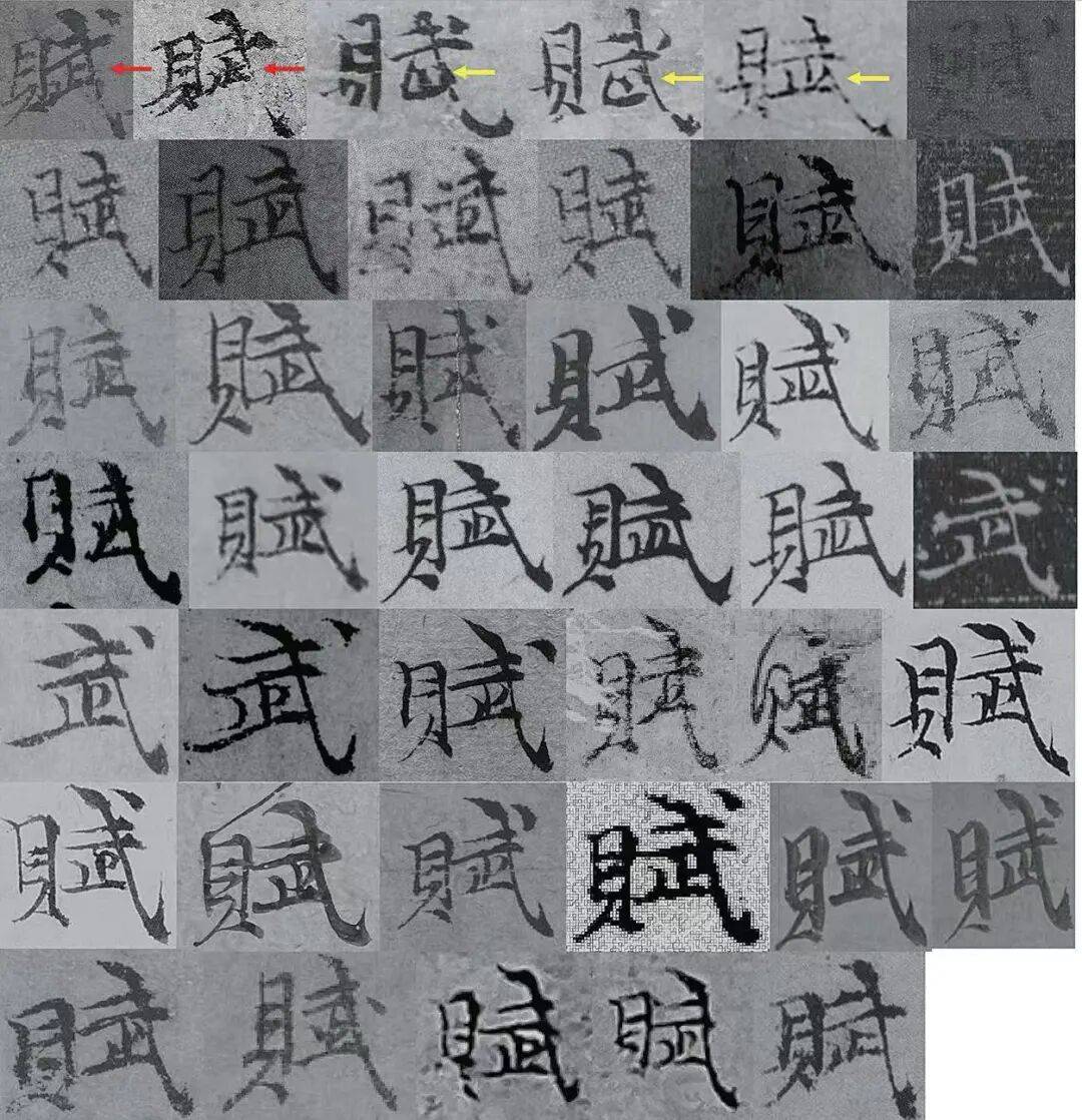 图 7ˉ“赋”字字例,各字例出处如下。第一行:《竹石图》、《苔痕树影图》、1(两例)、4、6;第二行:7、12、13、16、22、27; 第三行:30、33、34、47、49、51;第四行:52、53、55(3例)、57;第五行:59、63、69、75、78、79;第六行:79、82(两例)、85、89、94;第七行:97、伪3、伪9(两例)、伪19