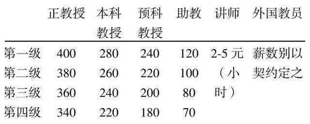 那时候,政府为大学的校长和教授制定了严格的工资标准。校长根据职级不同,每月工资分别为600元、500元、400元三个档次。学长(相当于院系主任)根据级别的不同,工资分别为450元、400元、350元和300元四个档次。至于正教授,根据职级不同,工资的标准从400元到300元不等,依次递减。而图书馆主任的工资则较为低廉,按照职级分为五档,每月分别为200元、180元、160元、140元、120元。