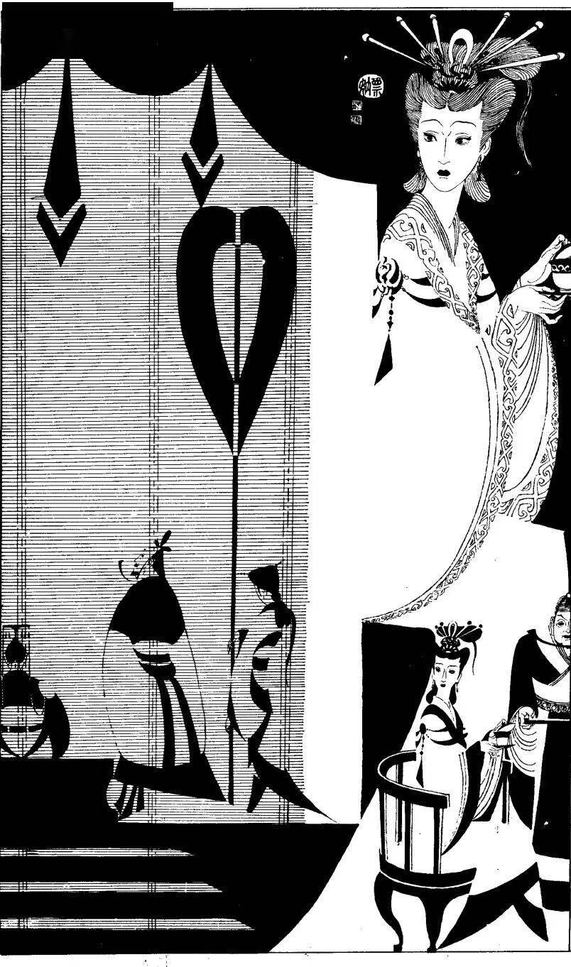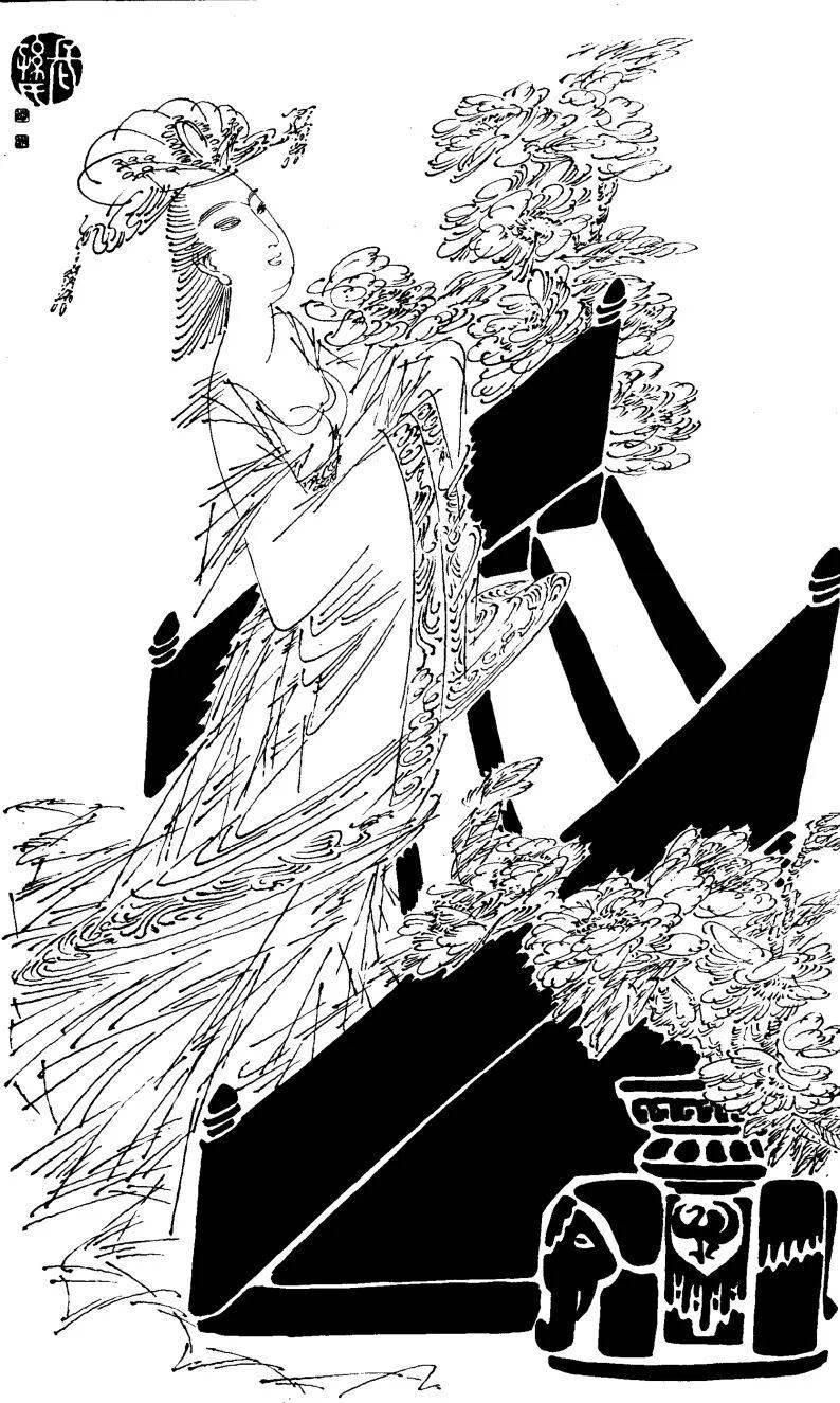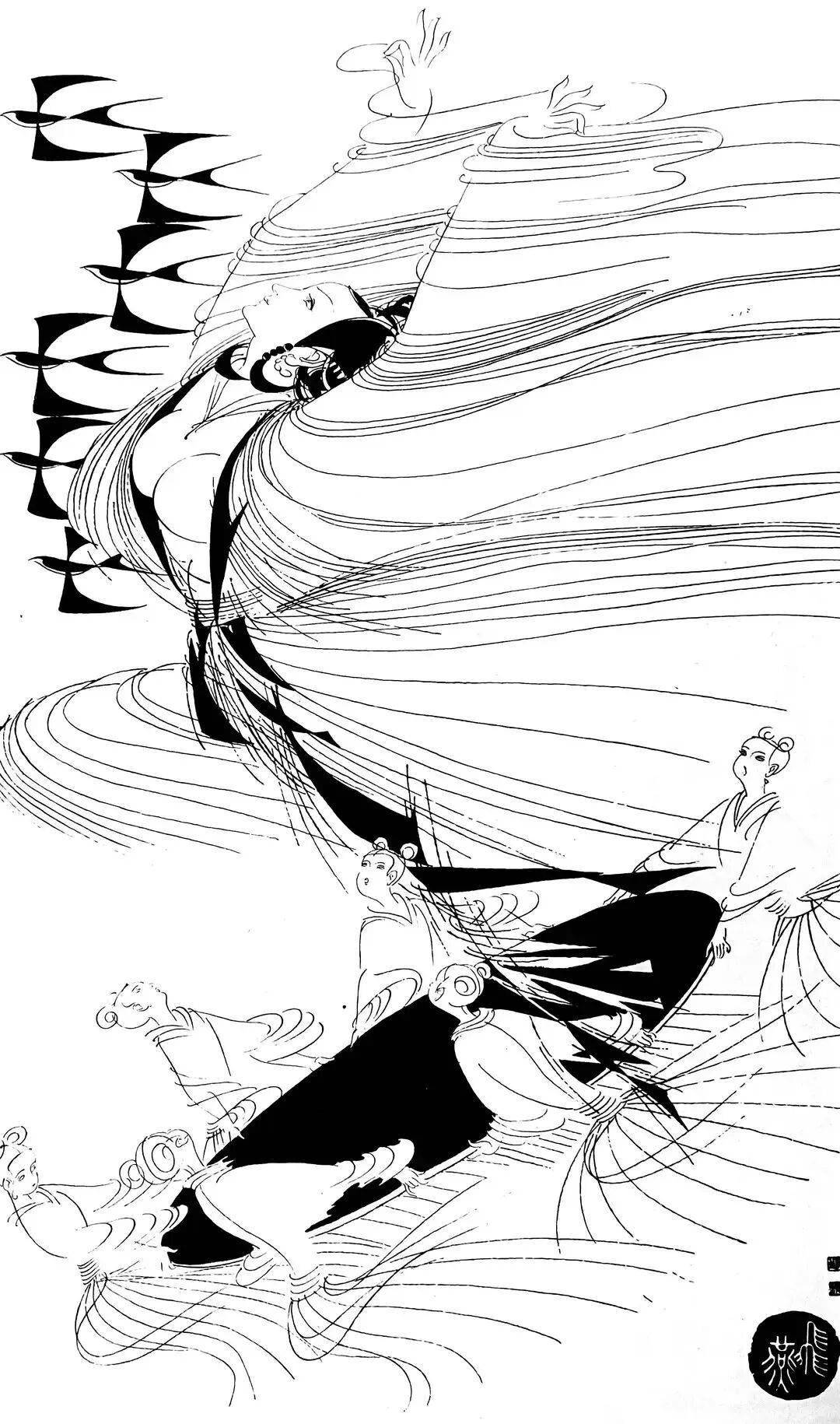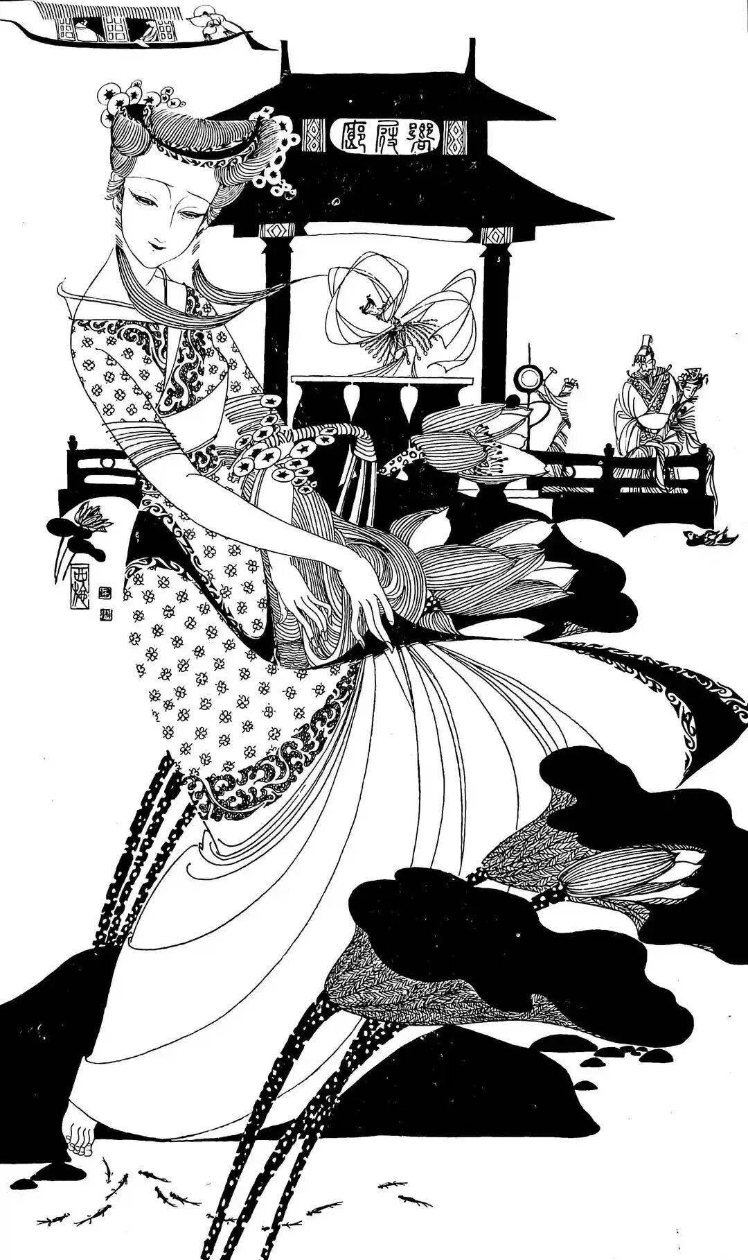 譬如《赵飞燕》一图,以大量密集的平行长线勾勒衣袂,突出她凌空起舞的轻盈,极具飞天般的飘逸感。