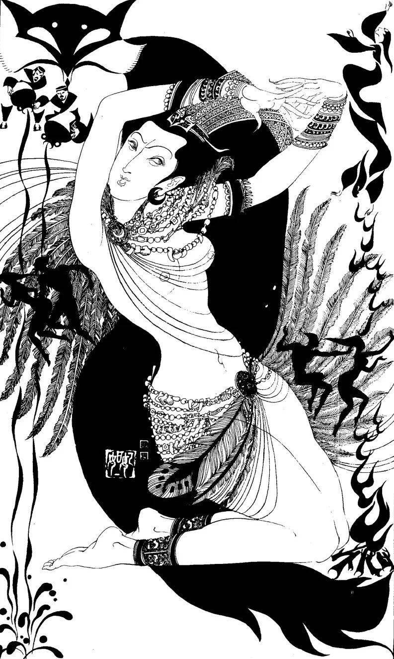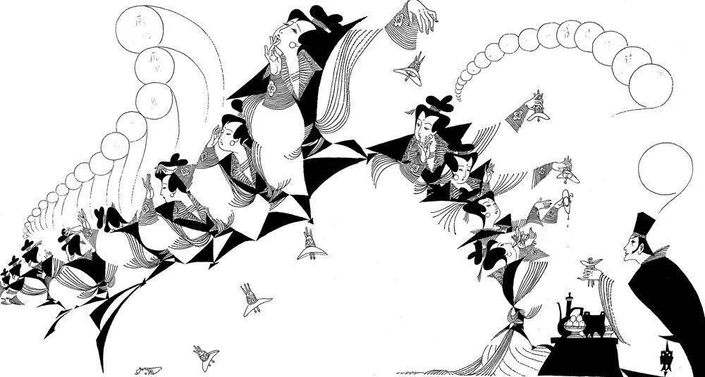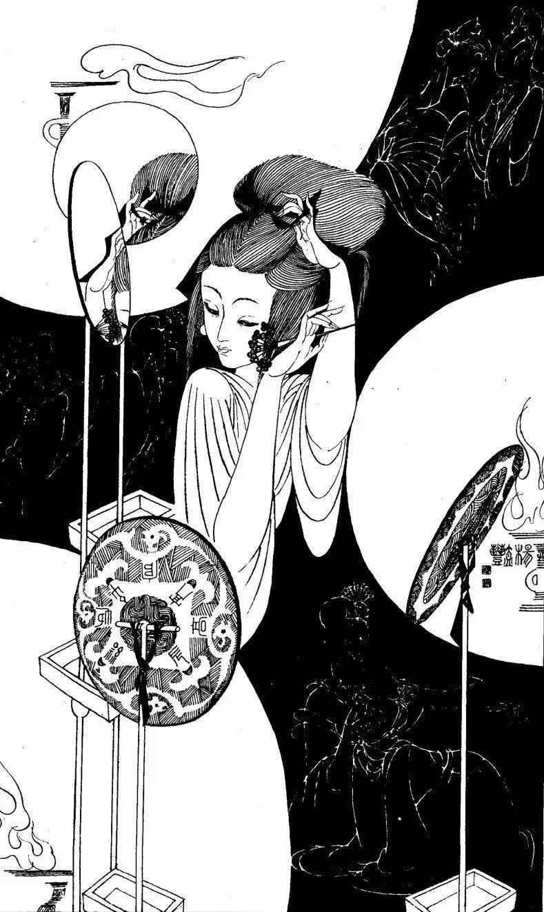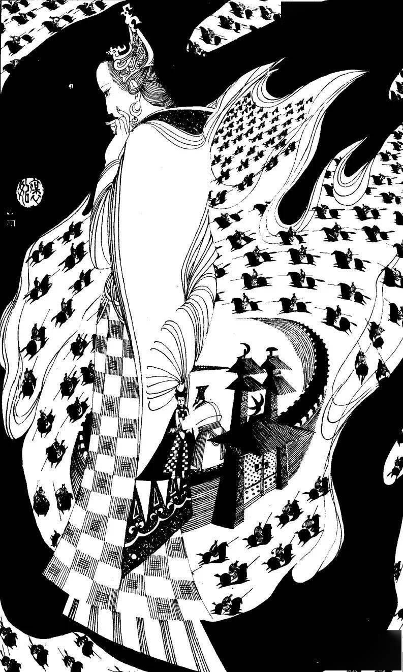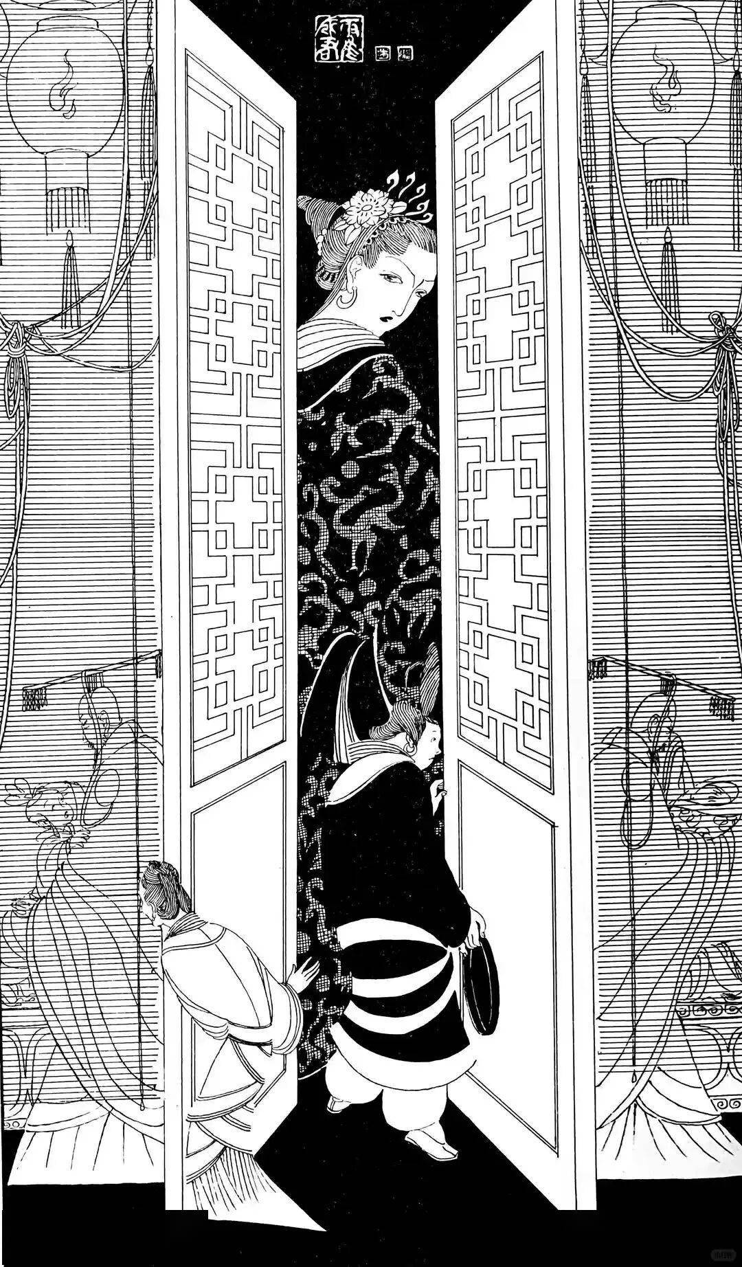 譬如《赵飞燕》一图,以大量密集的平行长线勾勒衣袂,突出她凌空起舞的轻盈,极具飞天般的飘逸感。