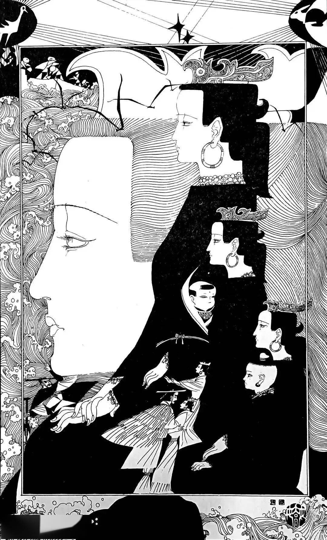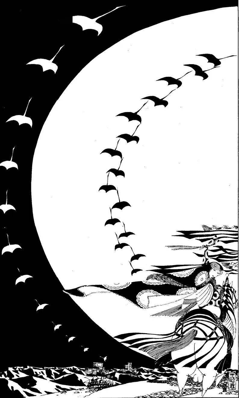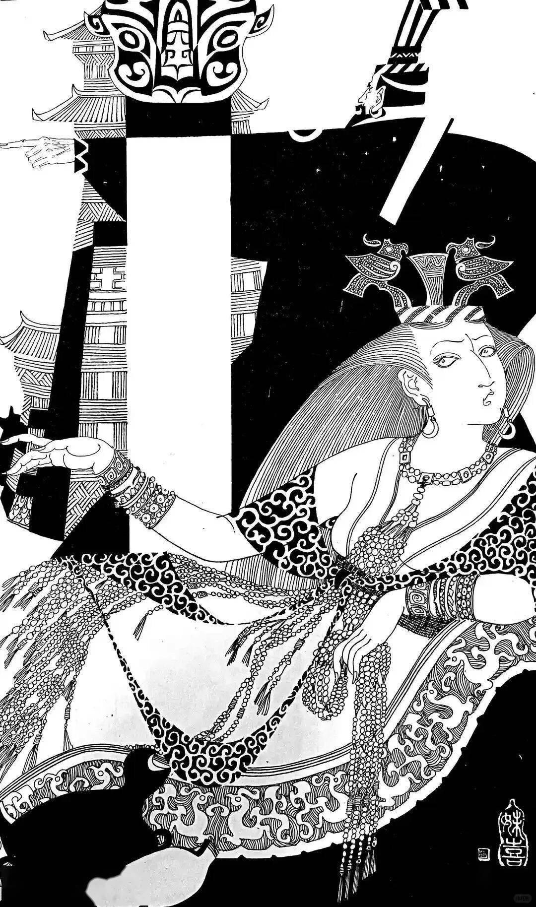 《昭君》图则用巨大的弧形和黑白对比刻画大漠苍穹、苍凉雁阵。人物在辽阔天地中显得渺小却坚毅。