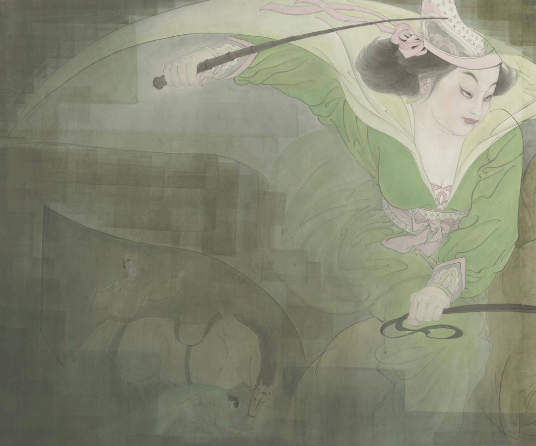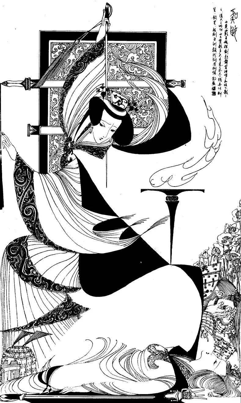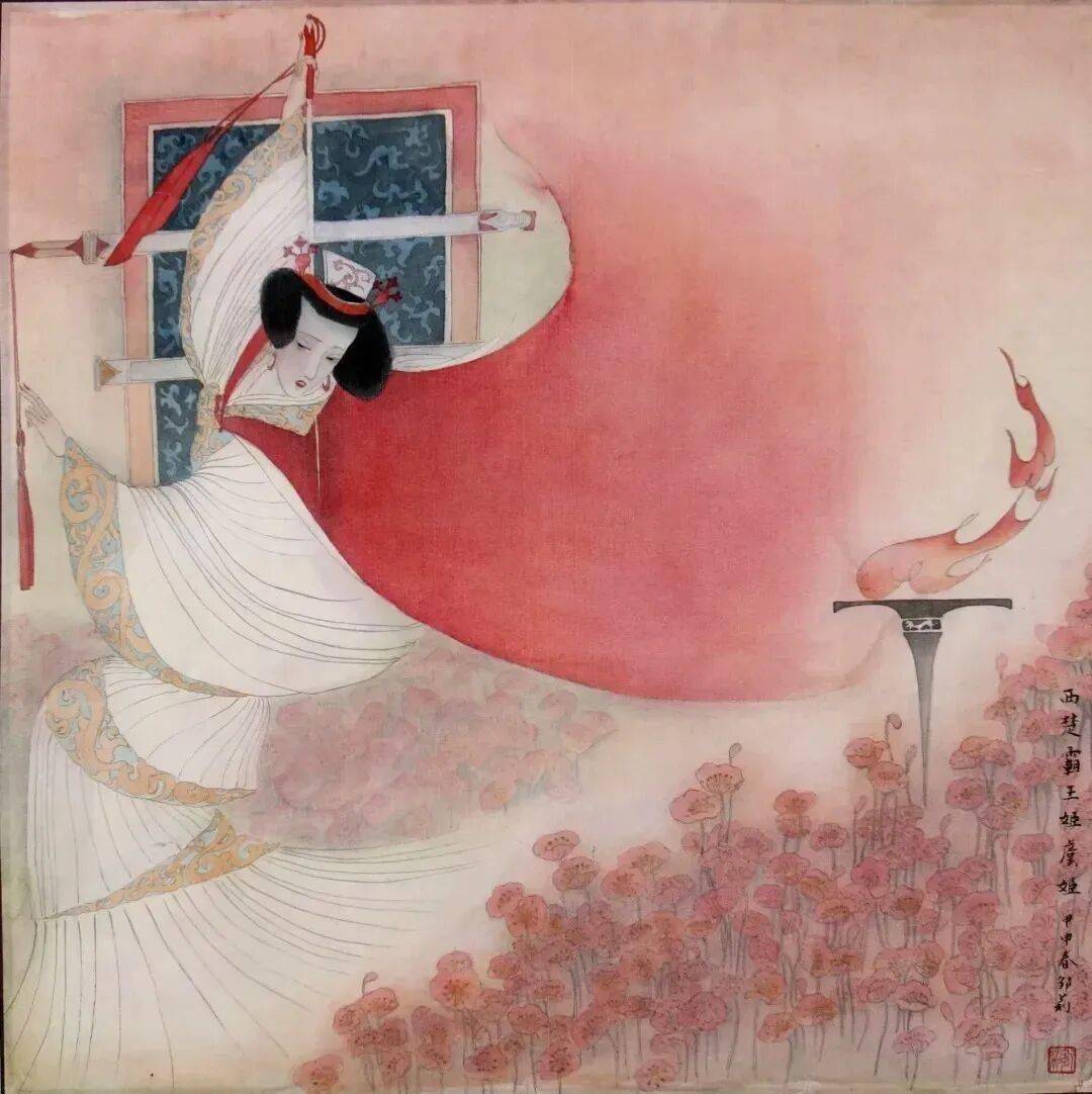 《虞姬》一图中,宝剑、飘带形成尖锐的对角线,传递出生死诀别时的刚烈与决绝。
