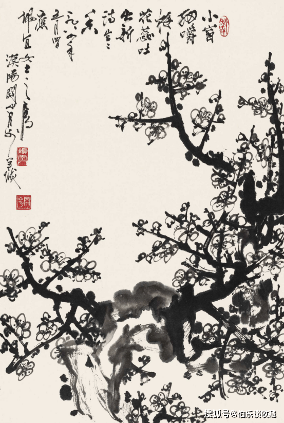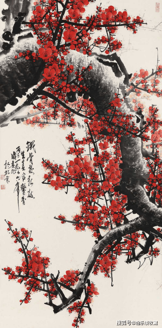 在古代的王冕、金农、汪士慎等画梅极具代表性。进入近现代,画梅名家同样辈出,他们在传统基础上融入了新的时代精神。作为岭南画派的代表人物,关山月笔下的梅花一扫传统文人的孤清之感,转而表现出雄浑、壮阔的气魄。他画的梅枝干如铁,苍劲有力;花朵则繁盛热烈,生机勃勃,极具视觉冲击力。