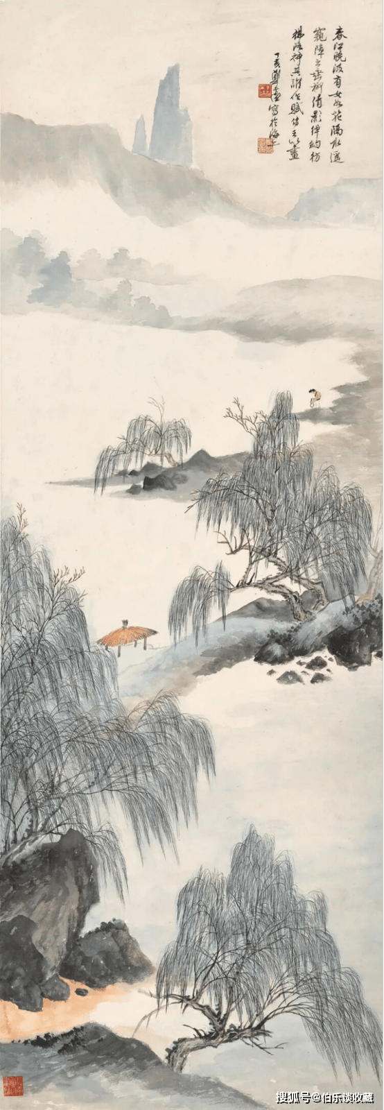 春江晓汲,有女如花。隔水遥窥,障之垂柳。倩影绰约,仿佛洛神。其谁作赋,传之以画。丁亥,郑午昌写于海上。