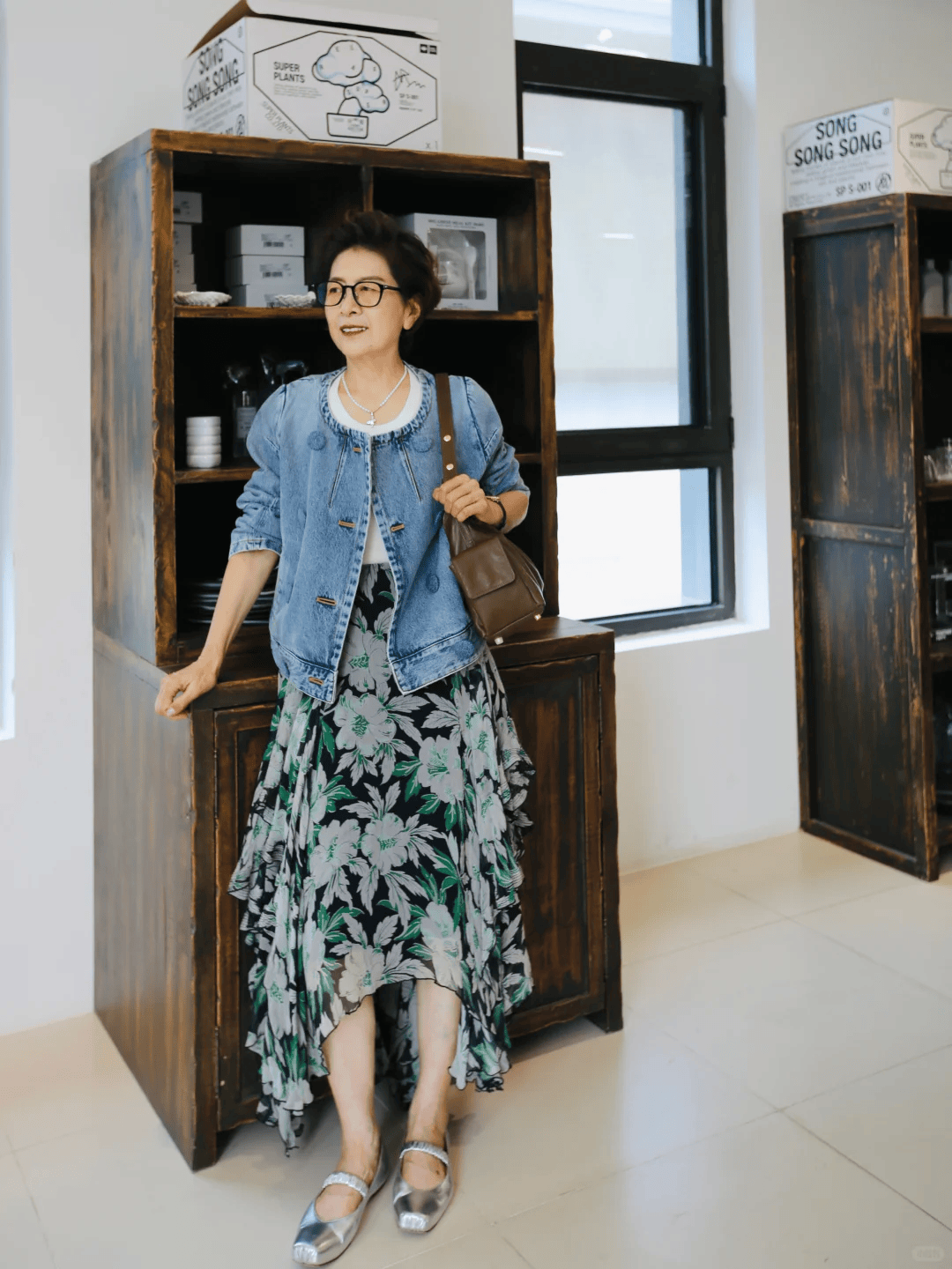 很多人觉得年过60岁的女性不适合穿得太花哨,这话虽然没错,但是适当的图案点缀,可以让造型更减龄,对于大龄女性来说,有时候一件合适的碎花单品,可以更显年轻哦,比如牛仔外套搭配一条不规则设计的碎花半裙。