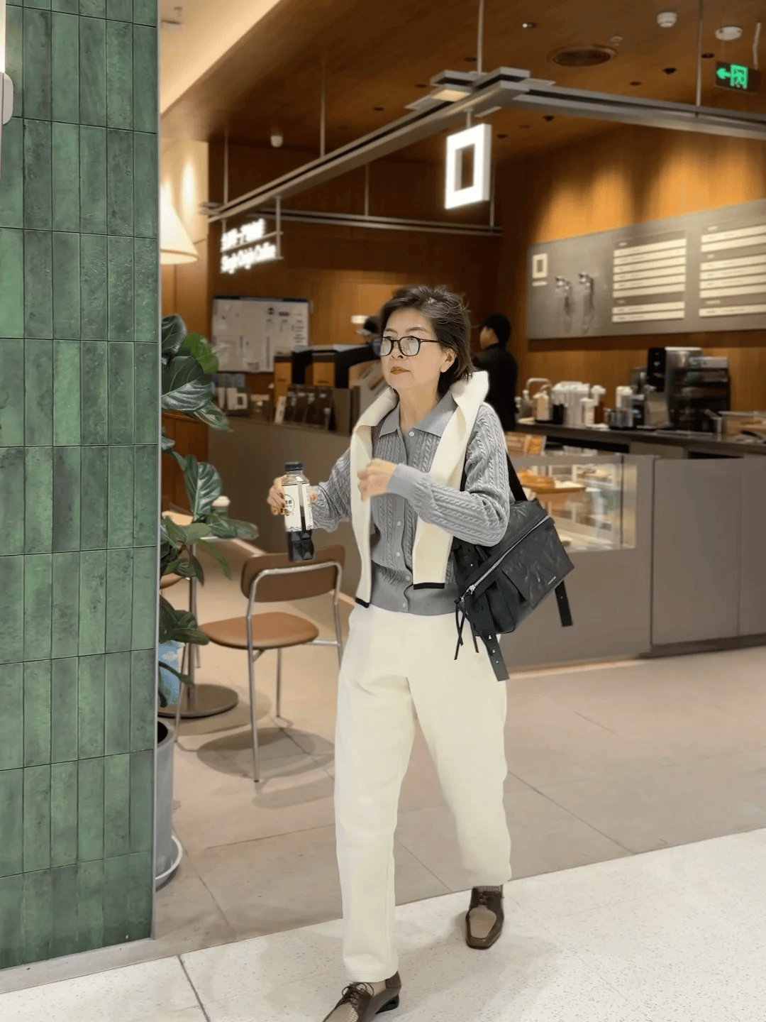 灰色开衫毛衣搭配米色萝卜裤+棕色乐福鞋,黑色挎包加持,再用米色针织衫当披肩,整体造型温柔又不失精致,轻松打造无龄感穿搭。
