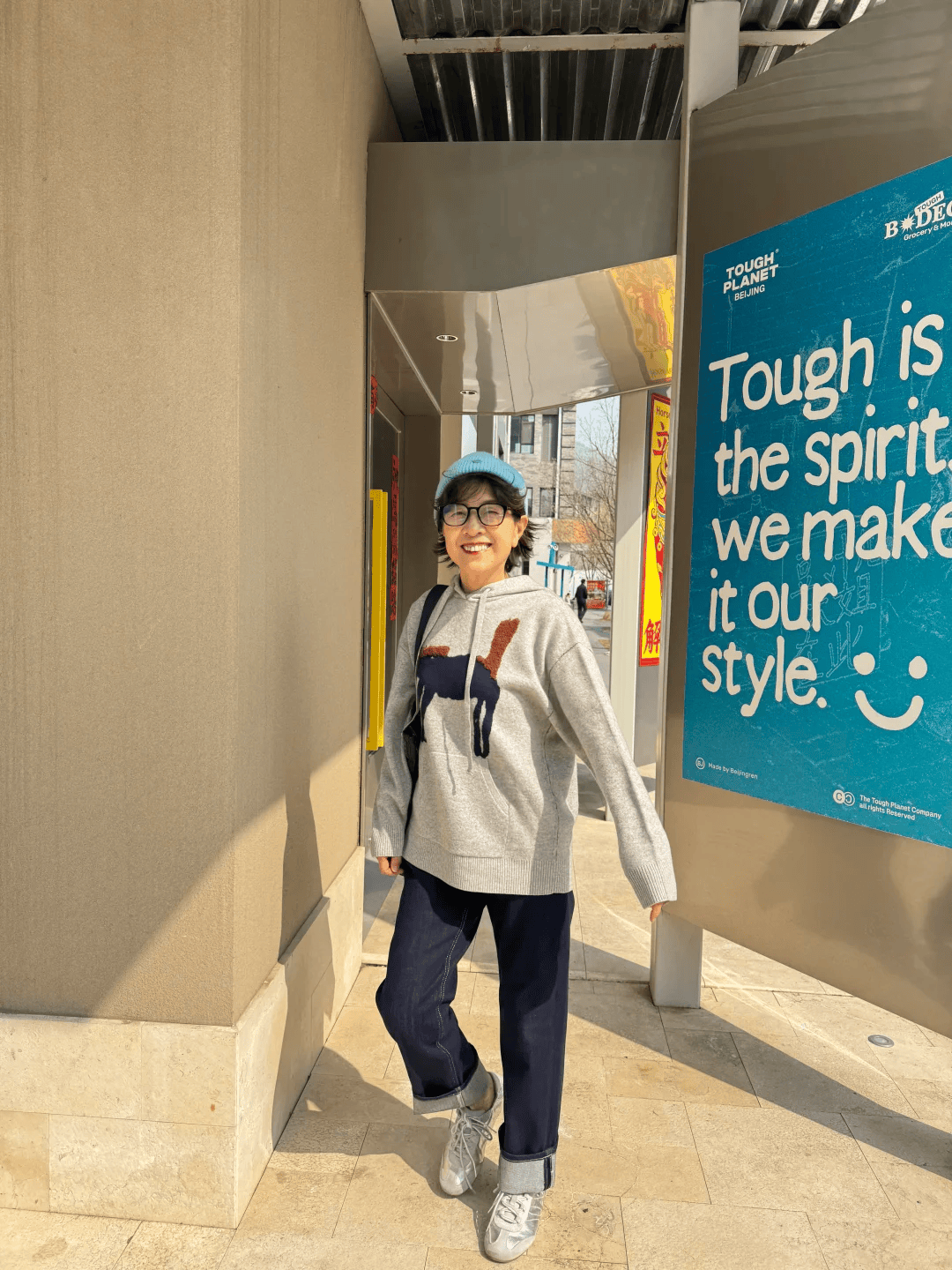 灰色提花连帽毛衣,休闲柔和又不失精致,连帽设计自带轻松减龄效果,完全不显老气。下搭深蓝色卷边牛仔裤,利落显瘦、随性自在,再配上一双白色运动鞋,整体舒适轻便、活力十足。简约耐看又有层次感,60+穿优雅不沉闷,日常出门时髦又大方。