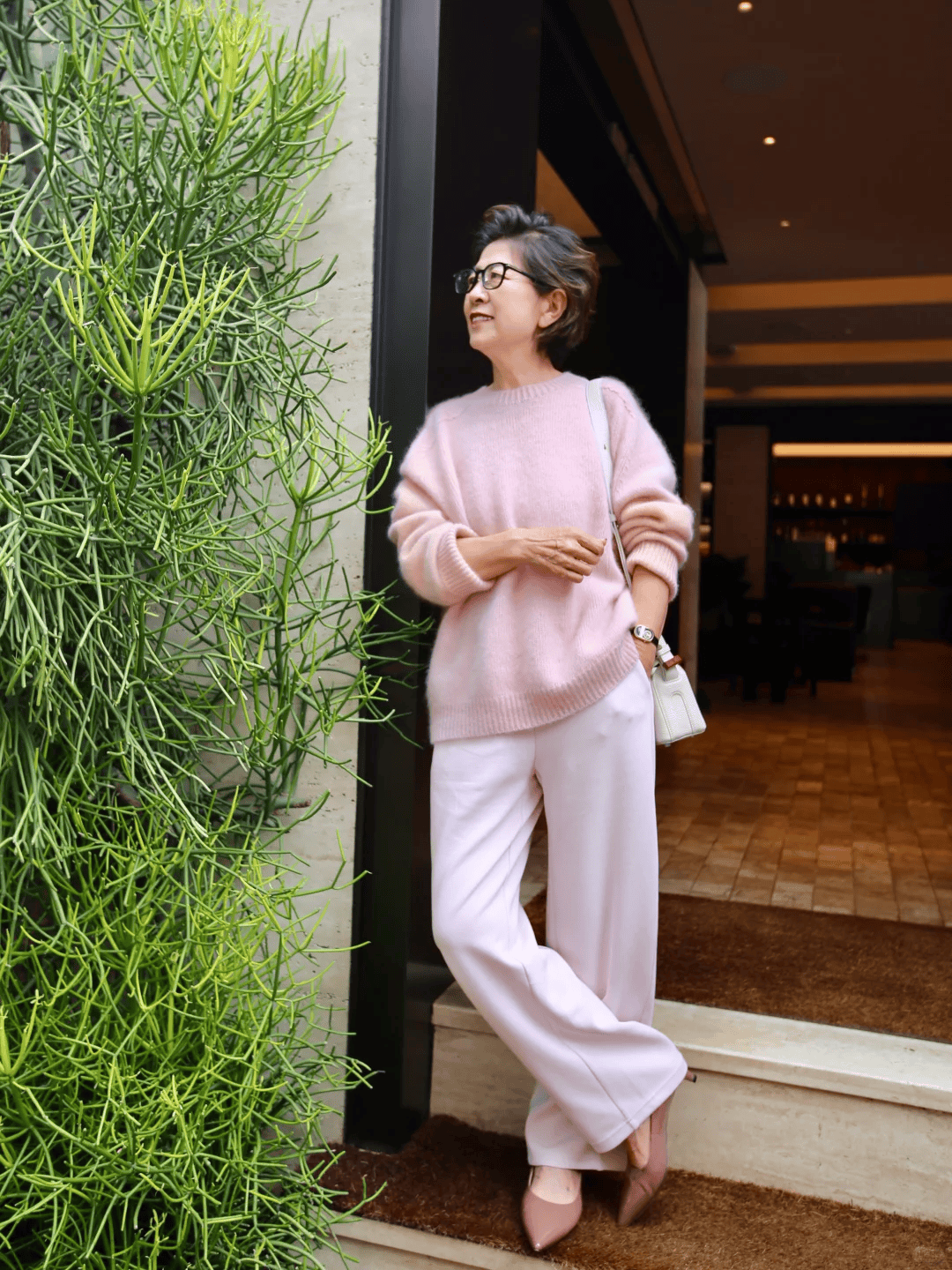 粉色系从来就不是少女的专属,选择低饱和度的浅粉色毛衣,搭配裸粉色针织阔腿裤,温柔到骨子里的优雅感,是对大龄女性最好的诠释,再搭配一只精致的米色挎包,提升造型的精致度,超级适合春日的穿搭。