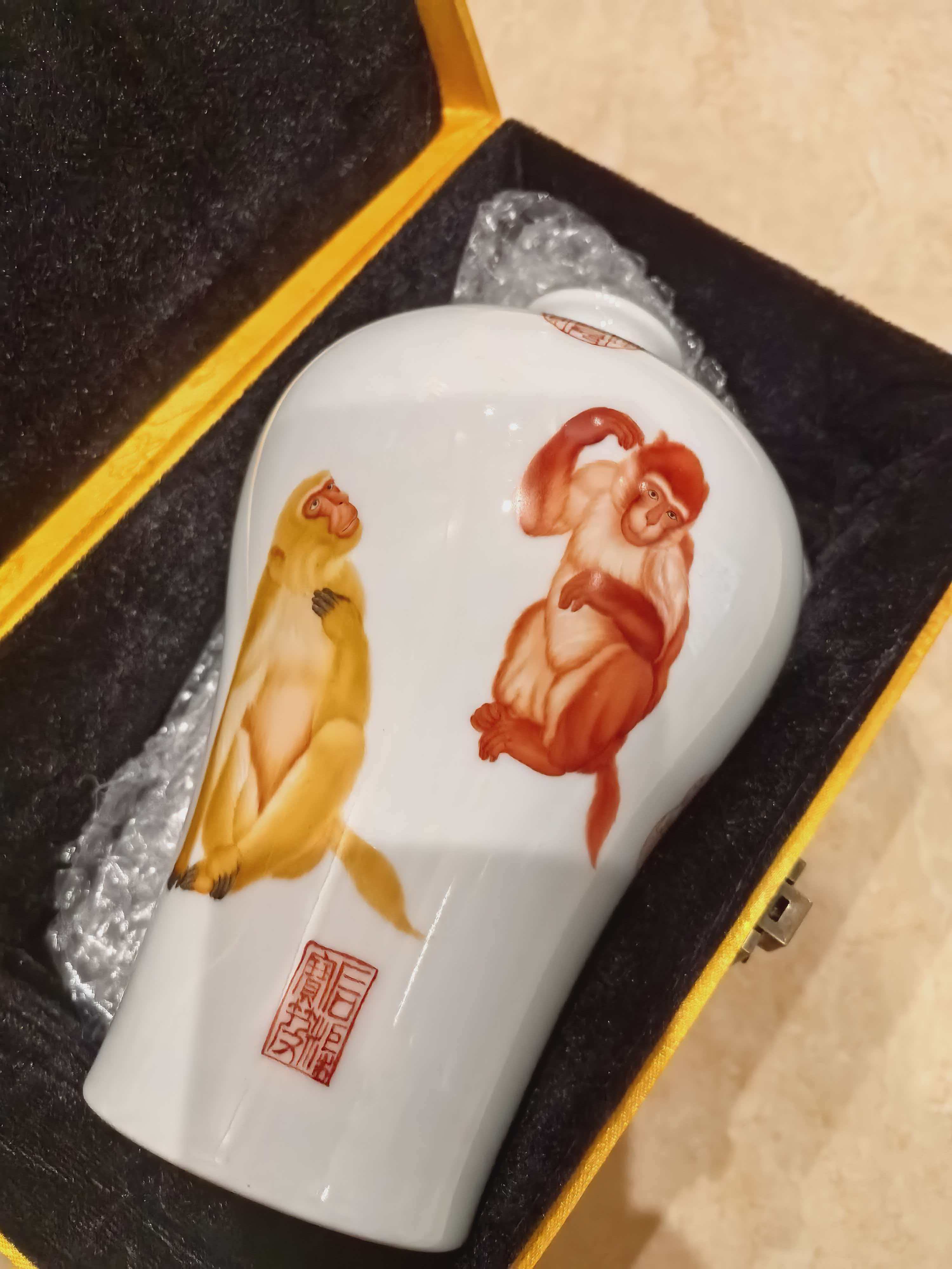 - **色彩晕染**:猴子毛发以黄、红、褐等彩料层层晕染,明暗对比清晰,立体感极强,如西方油画般写实,突破了中国传统瓷绘“平涂”的局限。