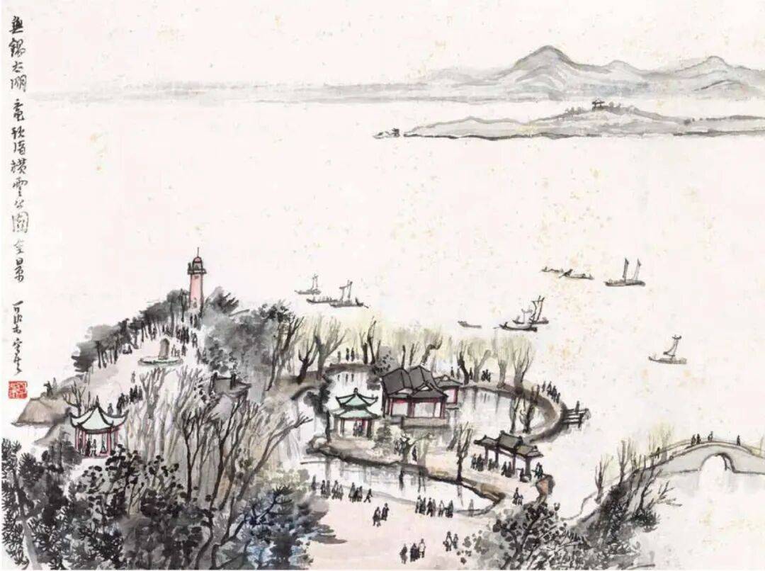 题款:无锡太湖,鼋头渚横云公园全景。可染写生。
