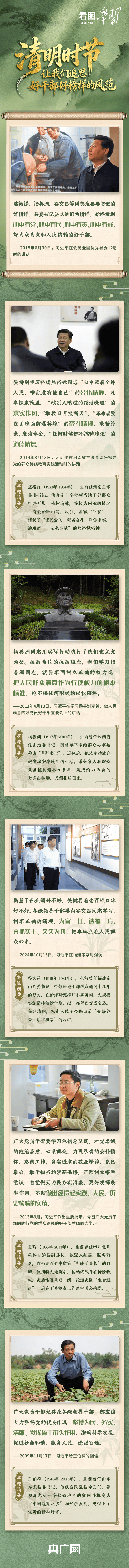 从“百姓谁不爱好官?把泪焦桐成雨”的夜半追思,到“先祭谷公,后拜祖宗”的群众口碑,从“草鞋书记”到“车轮子县长”……又是一年清明时节,让我们缅怀总书记称赞的百姓心中的好官,感悟他们勤政为民的风范。