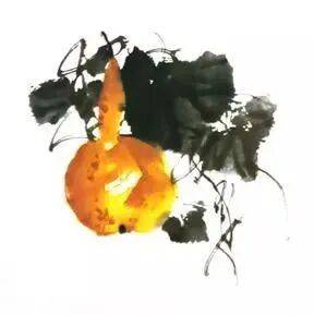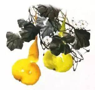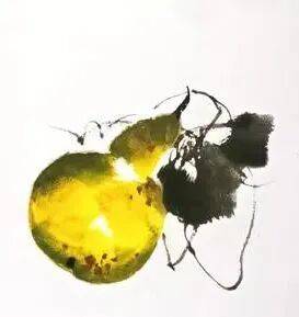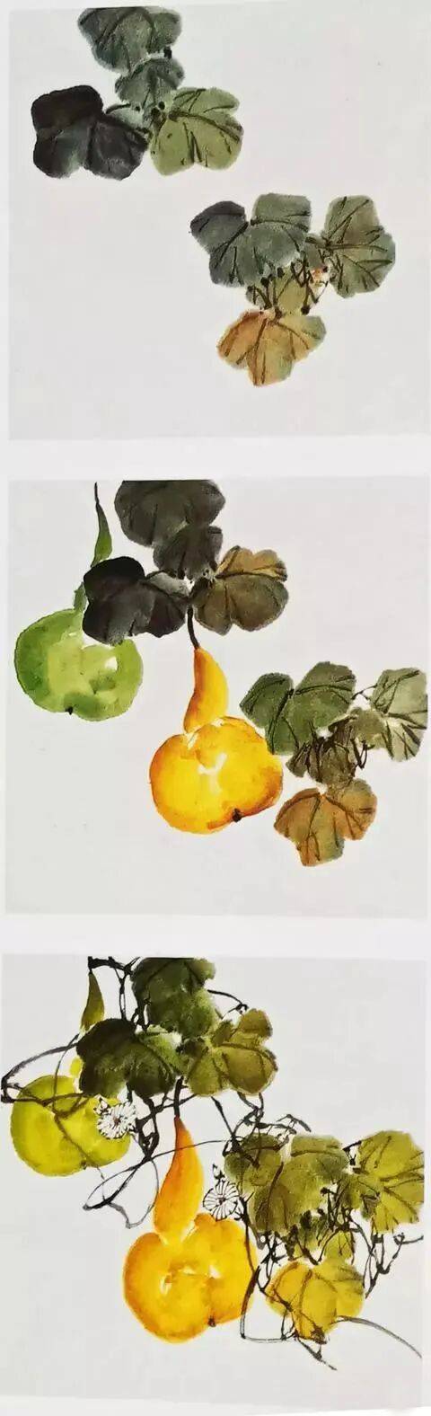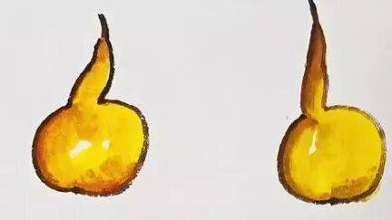 2.没骨画法:笔腹调黄色,笔尖加赭石、少许花青或石绿、墨淡,侧锋从左至右或上下用笔,留出高光,半干时用墨点画出果脐,注意葫芦造型不要大圆。