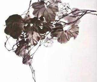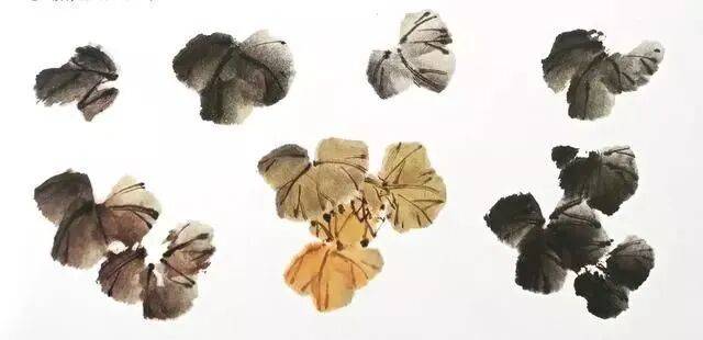 2.没骨画法:用提笔,笔腹调汁绿加花青,水份要饱满。笔尖蘸少许墨,侧锋写出三五笔掌状叶子,意叶子浓淡、大小变化。