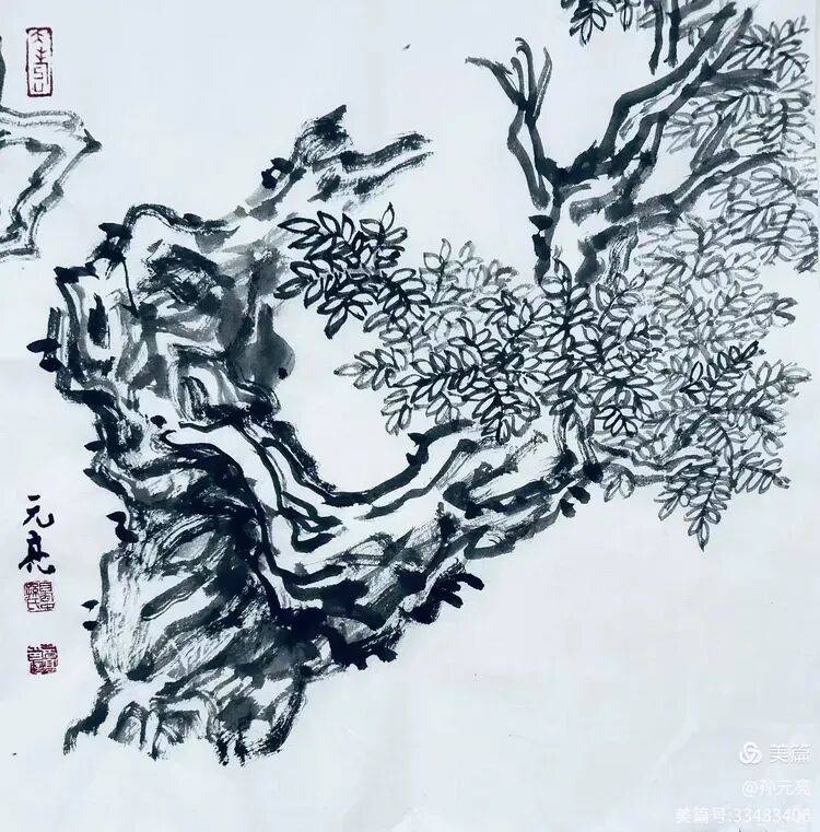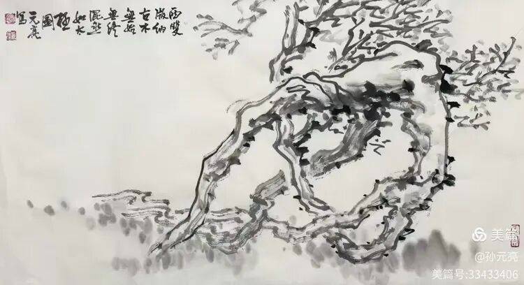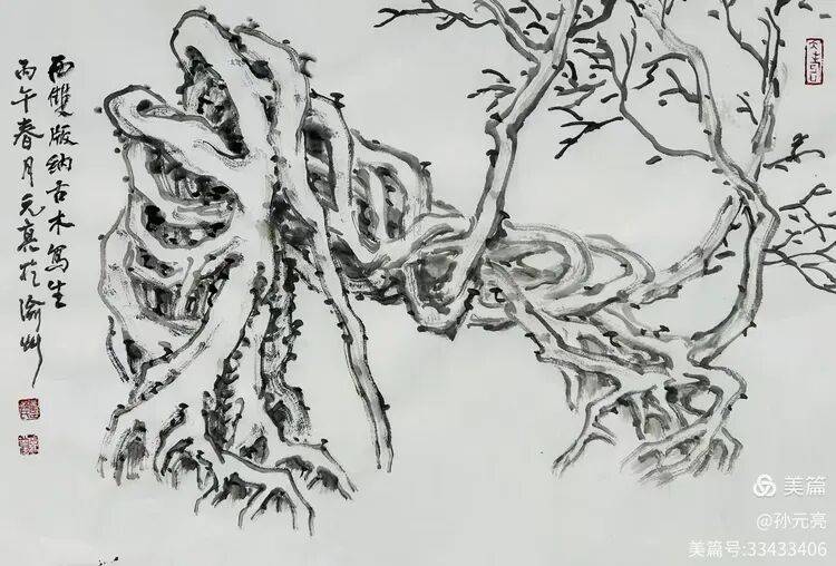 西双版纳植物园中有一株古木,其生态怪异,姿势奇酷,余写生时保留了它的基本特征,但必需的删减不可缺失,通过增添了一组回盼的小枝,既切割了画面,形成疏密关系,又形成老干与新枝的顾盼关系,终于让千年古树萌发出盎然生机。