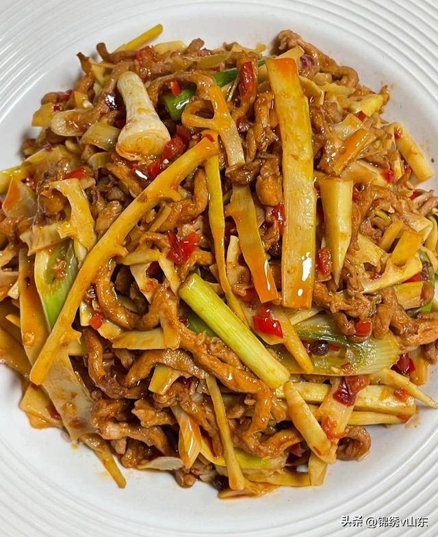 1. 春笋去皮洗净,切成丝,焯水备用;猪肉切成丝,用料酒、生抽、淀粉腌制。