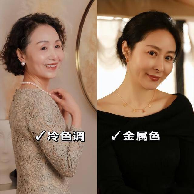 这是一个非常实用的色彩技巧。大多数亚洲中年女性的肤色都会伴随暗沉、发黄的问题。暖色调的黄金、红铜色首饰,容易与肤色融为一体,显得脏兮兮。相反,冷色调的金属,如银饰、白金、铂金,或者带有冷光的珍珠、钻石,能够与肤色形成鲜明的对比,起到“反差显白”的神奇效果。冷调首饰自带一种清冷的高级滤镜,能让整个人看起来更加清爽、利落,瞬间扫除“油腻感”。