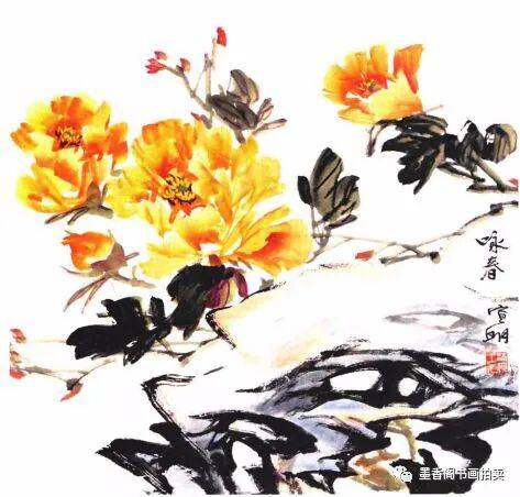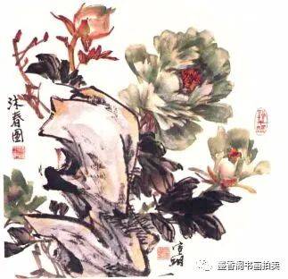 一幅牡丹画,若有石块配景作点缀和烘托才会显得更完美。其作用是,不同造型的石块与点缀物组合起来,使画面更丰富,形成多样统一的组合关系。石为自然界的精灵,历代牡丹画家均钟情画石,原因是石有重量,可起到稳定画面的作用。画时要分清前后关系,其物象也起到一定的间隔作用。