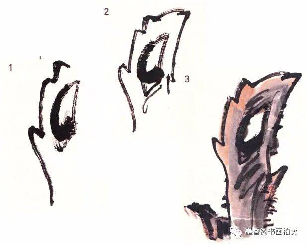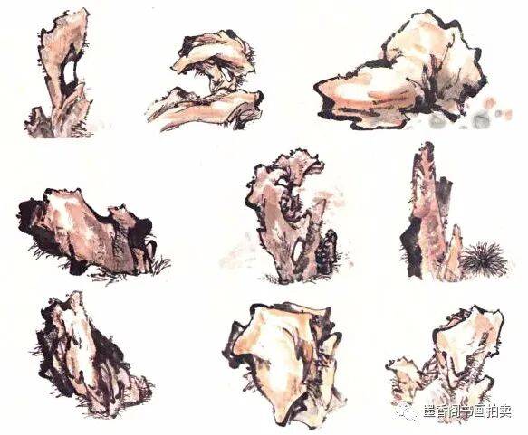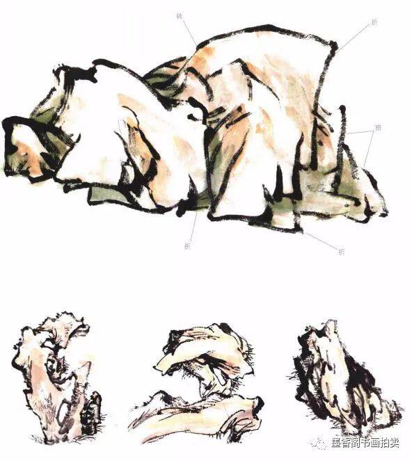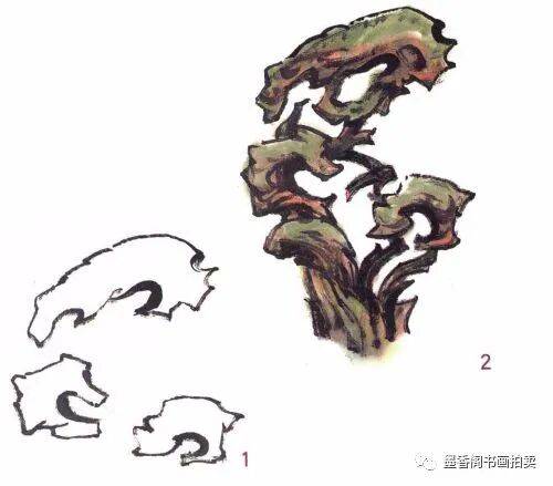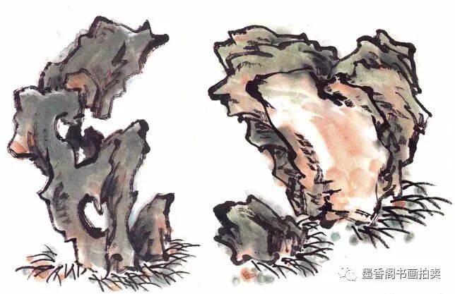 画湖石一般常用拖泥带水法,即先勾出轮廓,迅即皴擦,一气呵成,易得水墨淋漓的效果。