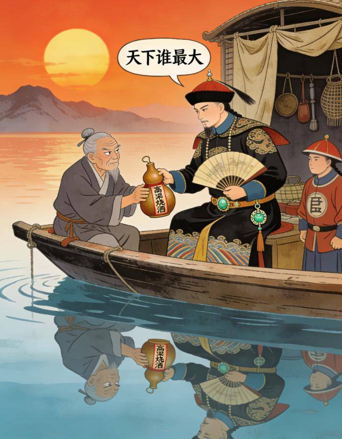 老渔夫也不戳穿,从船舱里拿出一个葫芦,递给康熙。