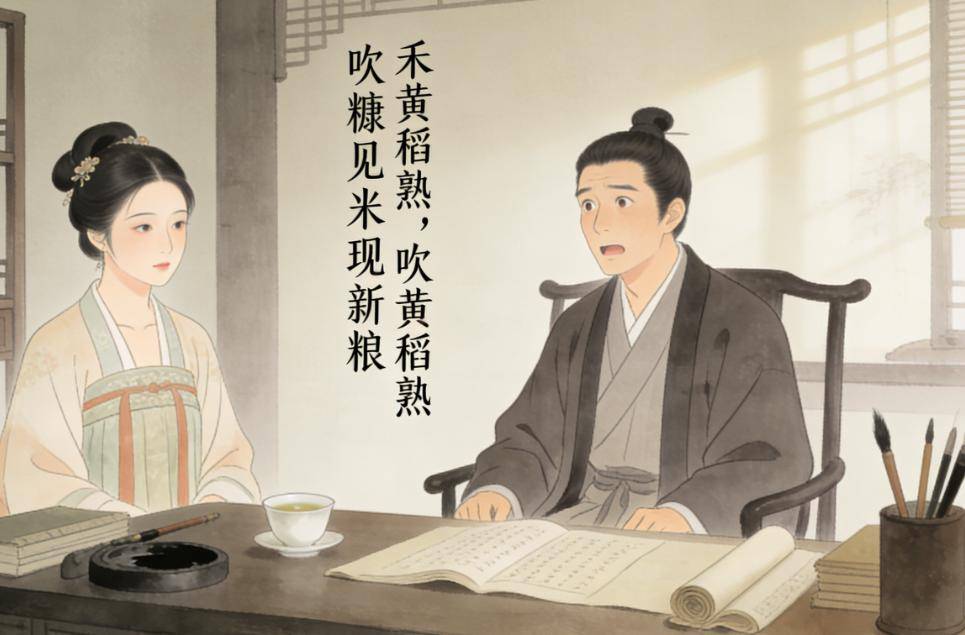 林秀娘深吸一口气,缓缓开口:"禾黄稻熟,吹糠见米现新粮。"